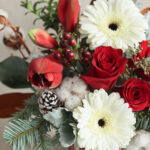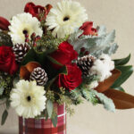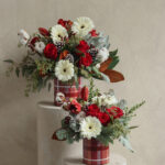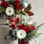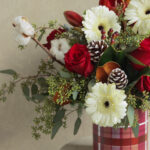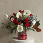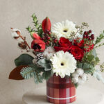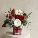 Traditional with a tartan twist! Festive holiday palette in deeper burgundy hues dressed in a plaid container. available in 2 sizes